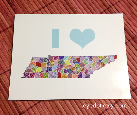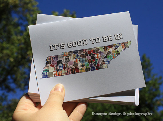Yesterday it was beautiful here in Nashville, so I felt inspired and made a new notecard celebrating the Volunteer State, with room for customization so that any county (or counties, why not) could be highlighted. I instantly had someone ask if I could make this into a 5×7 print, so I am going to work on that too!